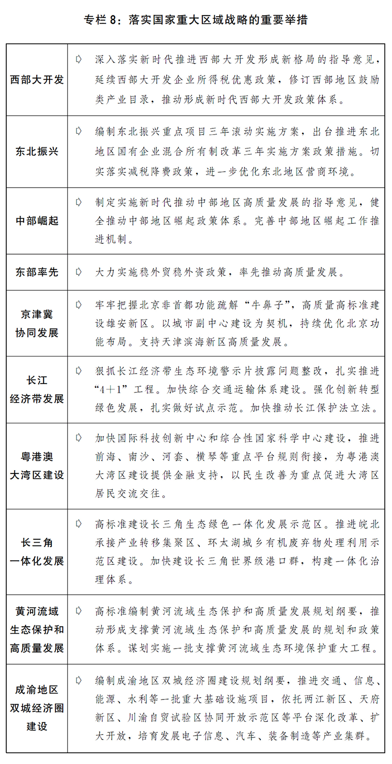 一是落實落細重大區域發展戰略。落實區域協調發展新機制,持續推進西部大開發形成新格局,支持東北地區全面振興全方位振興,健全中部地區崛起政策體系和工作機制,繼續推動東部地區率先發展。縱深推進京津冀協同發展,加快實施雄安新區重點建設項目,完善北京非首都功能疏解政策體系。大力推進長江經濟帶生態環境突出問題整改和系統性保護修復,加快構建綜合交通運輸體系,促進內河船舶改造。推動粵港澳大灣區基礎設施互聯互通,有序開展國際科技創新中心建設,加快橫琴、河套等重大合作平臺建設。高標準建設長三角生態綠色一體化示范區,推動長三角交通一體化更高質量發展,建設虹橋國際開放樞紐。抓緊做好黃河流域生態保護和高質量發展規劃綱要編制和出臺實施工作。大力支持成渝地區雙城經濟圈建設,打造全國高質量發展的重要增長極。積極推進西部陸海新通道建設。深化對口支援。支持少數民族和民族地區加快發展。推動國家級新區、開發區等功能平臺創新提升發展,加快推進資源型地區經濟轉型和老工業城市更新改造。推動山西開展能源革命綜合改革試點。繼續推進承接產業轉移示范區建設,在具備條件的內陸城市打造一批高端制造業基地。制定發展海洋經濟加快建設海洋強國的意見。完善主體功能區戰略和制度,編制《全國國土空間規劃綱要(2021-2035)》。