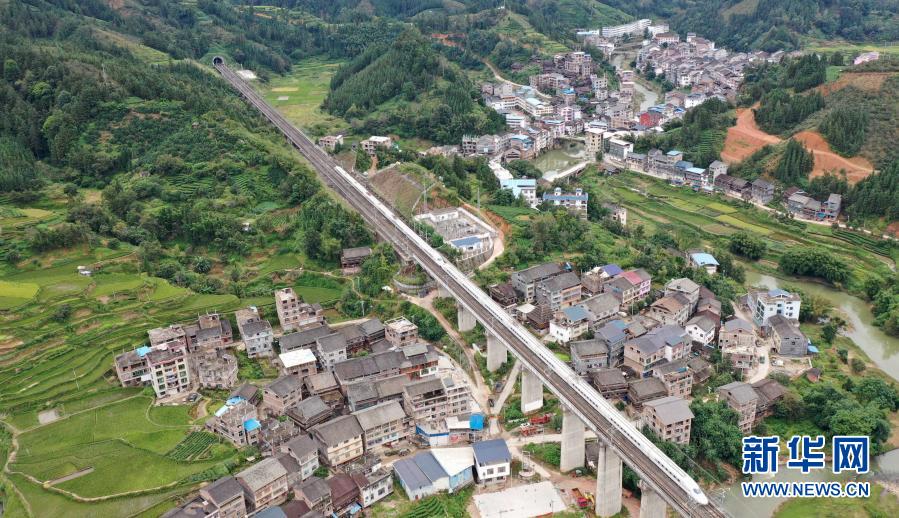 2020年10月4日,一列動車行經貴廣高鐵三江侗族自治縣同樂苗族鄉同樂村路段(無人機照片)。