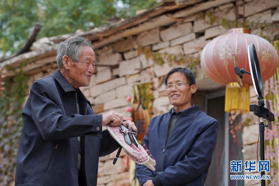 2020年10月28日,河北省沙河市柴關(guān)鄉(xiāng)大康村老支書李三平(左)在直播中推介村民手工制作的布鞋。今年年初,李三平在兒子李慶斌直播推介農(nóng)產(chǎn)品的過程中,應網(wǎng)友的要求加入直播,收獲了眾多網(wǎng)友點贊。在他的努力下,大康村的小米、蜂蜜等貨品銷路越來越廣,慕名前來的游客也更多了。
