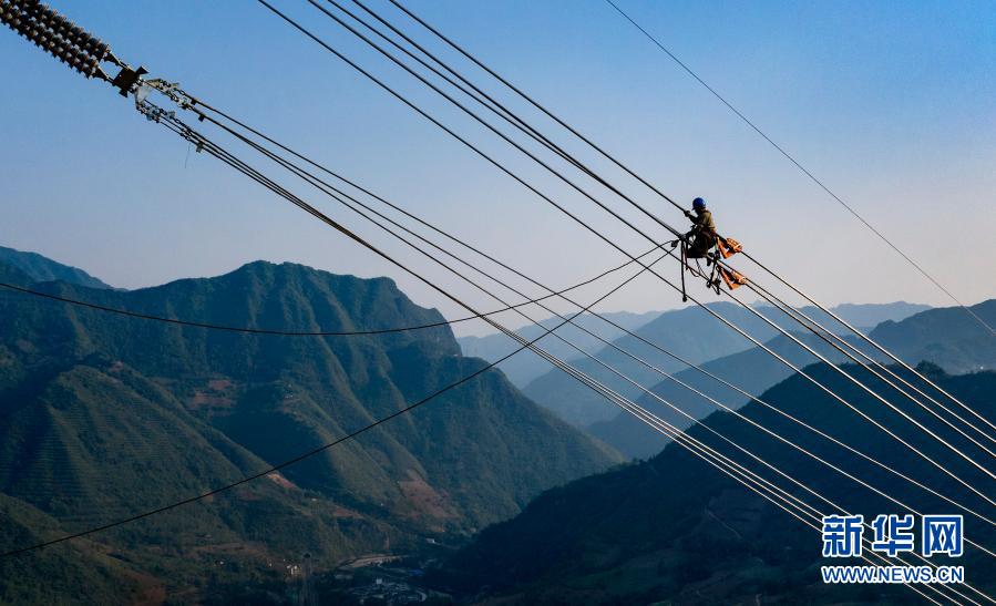 2020年5月3日,施工方國網四川電力送變電建設有限公司的員工在秦嶺之巔的高空緊線(無人機照片)。