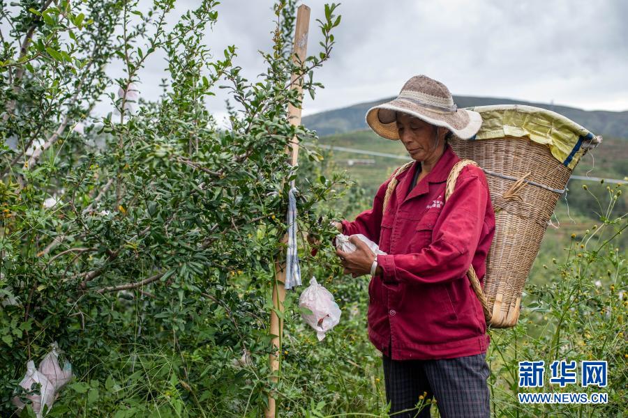 在云南省會澤縣娜姑鎮干海子村,干海子種植專業合作社的負責人莊錘兵正在地里管護石榴樹。