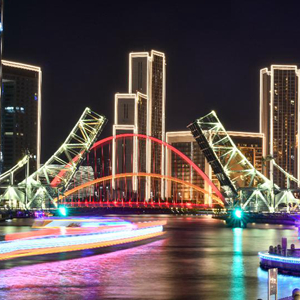這是5月1日晚拍攝的天津解放橋景觀(長時間曝光照片)。新華社發(孫凡越 攝)