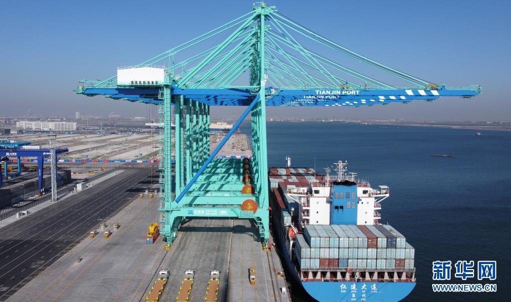 這是2021年1月17日拍攝的天津港北疆港區C段智能化集裝箱碼頭一號泊位(無人機照片)。新華社記者趙子碩 攝