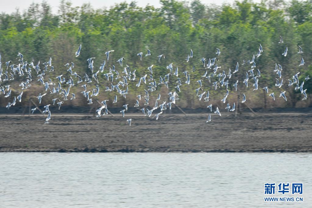 水鳥在天津市西青區西西海生態濕地上空飛翔(4月27日攝)。新華社發(孫凡越 攝)