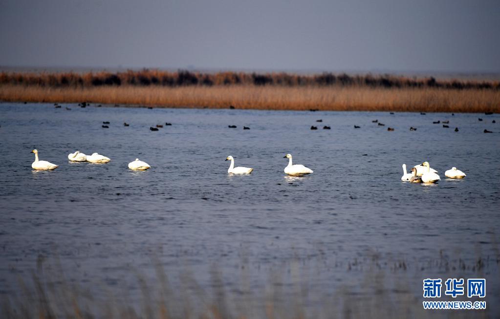 2020年11月12日,天鵝在天津北大港濕地自然保護區棲息。新華社記者趙子碩 攝