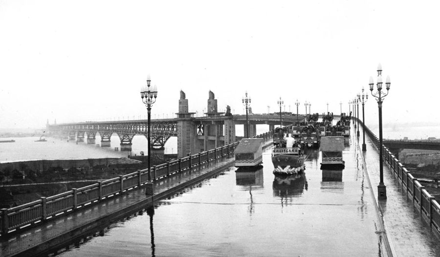 1968年12月29日,南京市5萬多軍民歡聚在江邊橋頭,隆重舉行大會,慶祝南京長江大橋全面建成。慶祝大會結束后,紅色的信號彈騰空而起,在一片鞭炮和鑼鼓聲中,100多輛滿載南京群眾代表的彩車徐徐通過公路橋。頓時,大江南北,橋上橋下,車內車外,一片歡騰,歡呼聲震撼大地,響徹云霄。