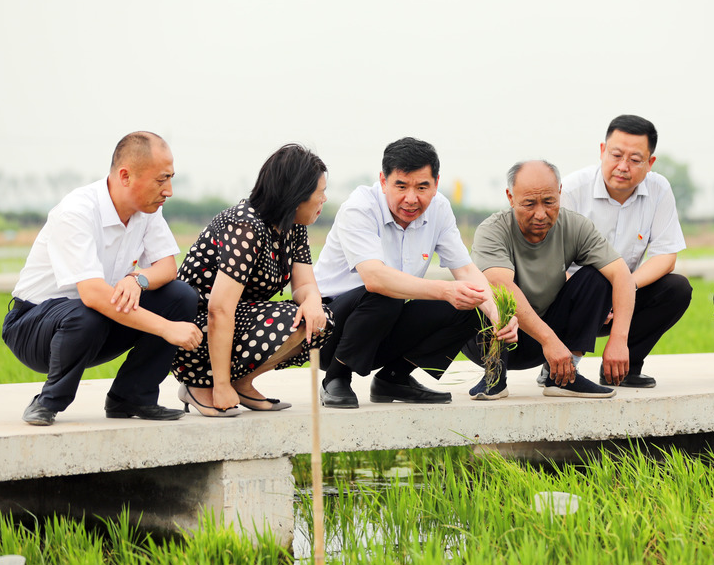 日前,劉斯杰(左三)在東營市墾利區耐鹽堿水稻實驗基地察看水稻長勢。(墾利區委宣傳部提供)