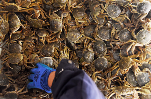 秋季,東營黃河口大閘蟹養殖區工人撿拾大閘蟹的情景。新華社記者 王凱攝