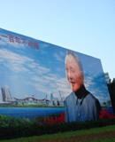 廣場一端的巨幅畫像上,改革開放的總設計師鄧小平身著淺灰色中山裝,堅毅地凝視著前方。畫面左上方寫著:“堅持黨的基本路線一百年不動搖。”