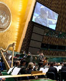 國東部時間5月20日下午,紐約曼哈頓,聯合國總部大會廳。一場中美軍樂團聯合音樂會隆重舉行。首次走進聯合國的中國人民解放軍軍樂團,演奏了《歌唱祖國》為音樂會“壓軸”。激昂的樂曲在這里回蕩,難忘的歷史在這里流淌……