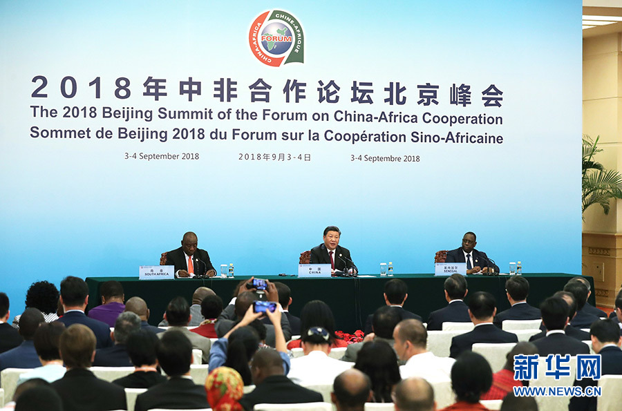 新華社北京9月4日電(記者鄭明達、孫奕)4日,2018年中非合作論壇北京峰會閉幕后,國家主席習近平同論壇前任共同主席國南非總統拉馬福薩、新任共同主席國塞內加爾總統薩勒在人民大會堂共同會見記者。