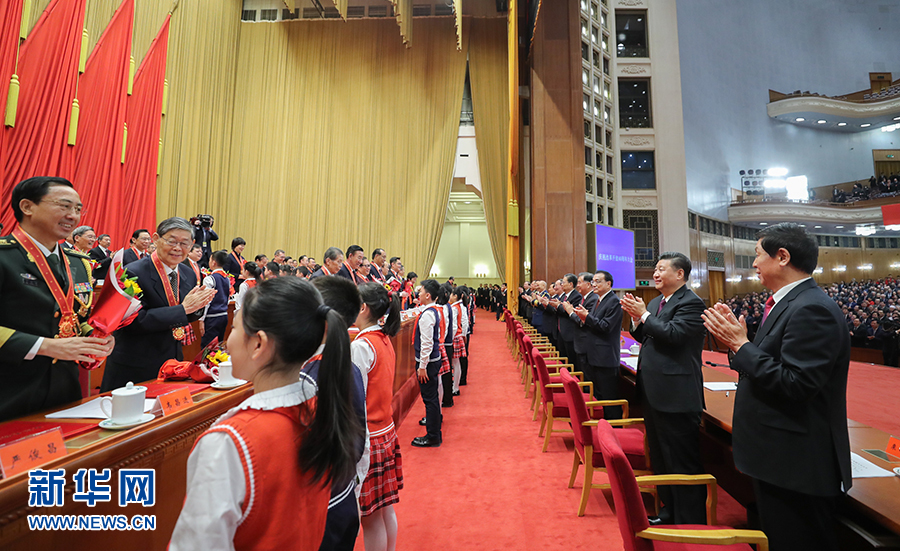 12月18日,慶祝改革開放40周年大會在北京人民大會堂隆重舉行。中共中央總書記、國家主席、中央軍委主席習近平在大會上發表重要講話。這是習近平等鼓掌向受表彰人員表示祝賀。 新華社記者 鞠鵬 攝