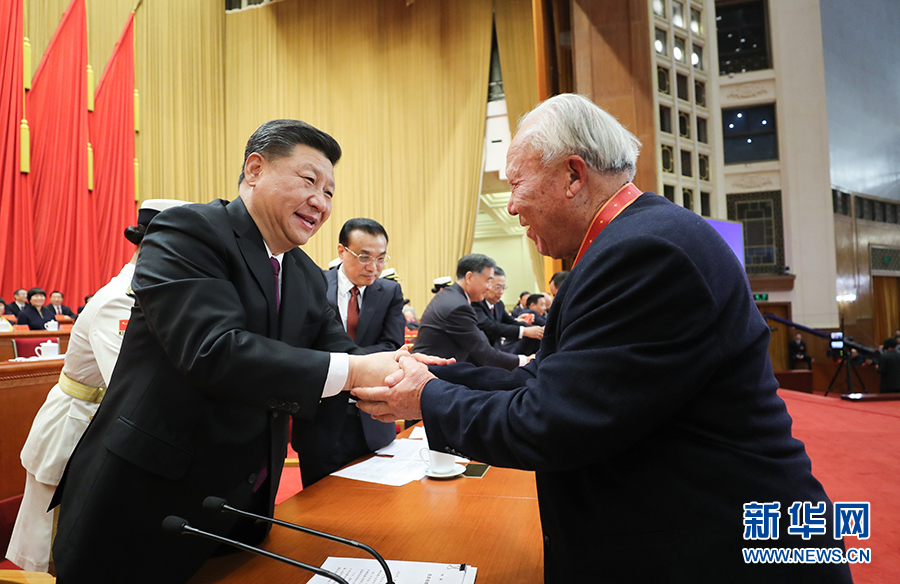 12月18日,慶祝改革開放40周年大會(huì)在北京人民大會(huì)堂隆重舉行。中共中央總書記、國(guó)家主席、中央軍委主席習(xí)近平在大會(huì)上發(fā)表重要講話。這是習(xí)近平等為獲得改革先鋒稱號(hào)人員代表頒獎(jiǎng)。 新華社記者 鞠鵬 攝