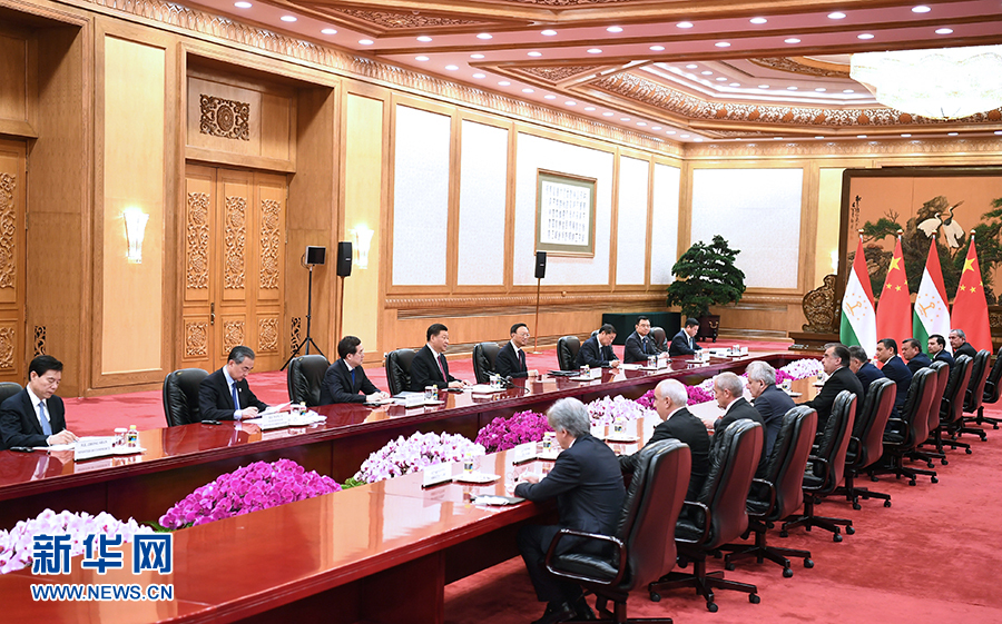 4月28日,國家主席習近平在北京人民大會堂會見塔吉克斯坦總統拉赫蒙。 新華社記者 謝環馳 攝