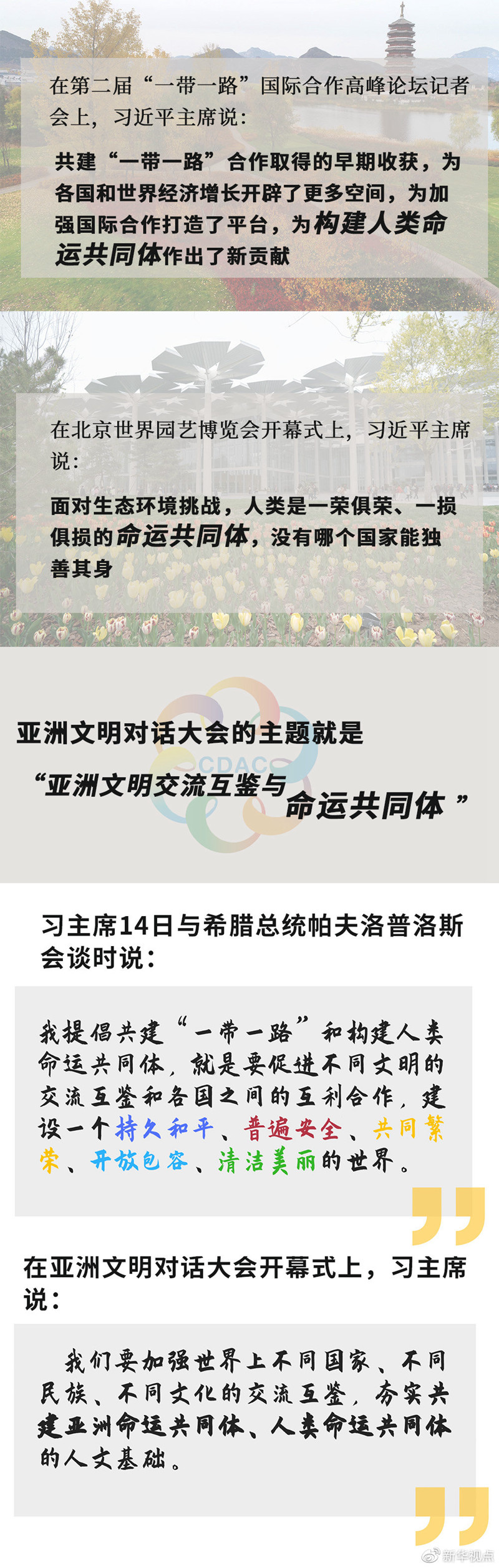 半個多月來,世界的目光一次次聚焦北京。從第二屆“一帶一路”國際合作高峰論壇,到2019年中國北京世界園藝博覽會,再到亞洲文明對話大會,三場活動主題不同,卻有一個關鍵詞貫穿始終:命運共同體。