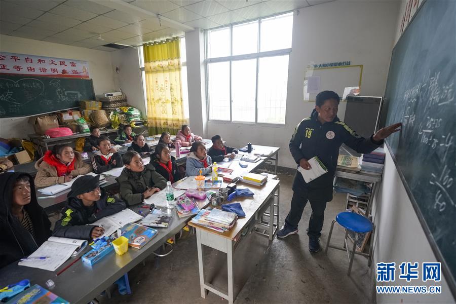 瓦吾小學教師曲比史古(右一)在給五年級學生上數學課(5月27日攝)。新華社記者 沈伯韓 攝