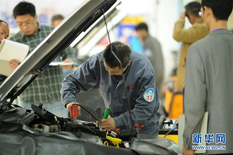 參賽選手在貴陽市第二屆技能之星競技大賽決賽汽車維修項目比賽中(2015年11月17日攝)。大賽吸引5000余名來自貴州省中、高等職業院校的學生參加。新華社記者 陶亮 攝