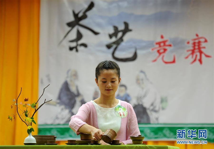 參賽選手在貴陽市第二屆技能之星競技大賽決賽茶藝展示比賽中(2015年11月17日攝)。大賽吸引5000余名來自貴州省中、高等職業院校的學生參加。新華社記者 陶亮 攝