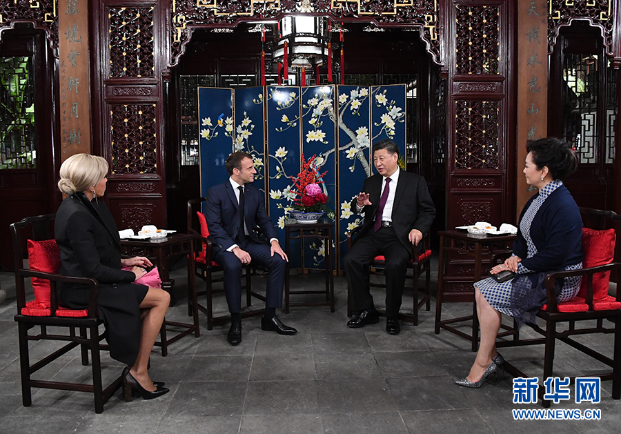 兩國元首夫婦在玉華堂落座。習近平和彭麗媛愉快地憶及今年3月訪問法國受到馬克龍夫婦熱情款待的情景。習近平說,歡迎馬克龍總統再次訪華并第一次來上海。上海是中國改革開放和發展進步的縮影,體現了近代以來中國同世界關系的演變。希望這次訪問有助于你了解上海、了解中國。我和夫人選擇在豫園款待總統先生和夫人,希望你們能領略中華園林之美和中國的傳統文化。文化藝術表現形式不同,但帶給不同國家民眾的心靈體驗是相通的,不同文化可以和諧共生。中法作為東西方兩大文明代表,應該相互尊重,交流互鑒,各美其美,美美與共。