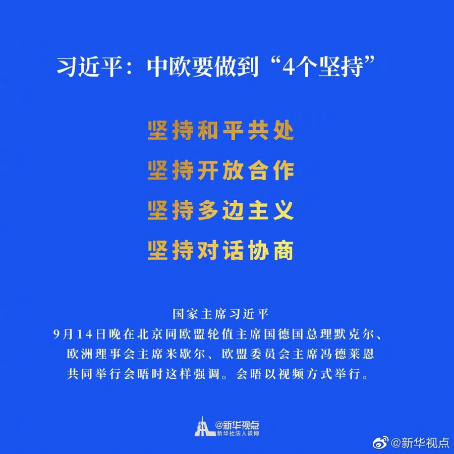 習近平強調,新冠肺炎疫情大流行使百年未有之大變局加速演進,人類站在新的十字路口。中歐要堅定不移推動全面戰略伙伴關系健康穩定發展,做到“4個堅持”:堅持和平共處,堅持開放合作,堅持多邊主義,堅持對話協商。