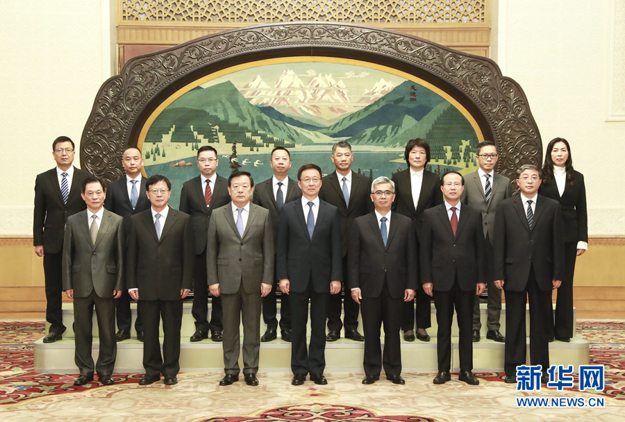 9月16日,中共中央政治局常委、國務(wù)院副總理、中央港澳工作領(lǐng)導(dǎo)小組組長韓正在北京人民大會(huì)堂會(huì)見澳門特別行政區(qū)保安司司長黃少澤率領(lǐng)的澳門紀(jì)律部隊(duì)高層代表團(tuán),與他們交流并合影留念。 新華社記者 龐興雷 攝