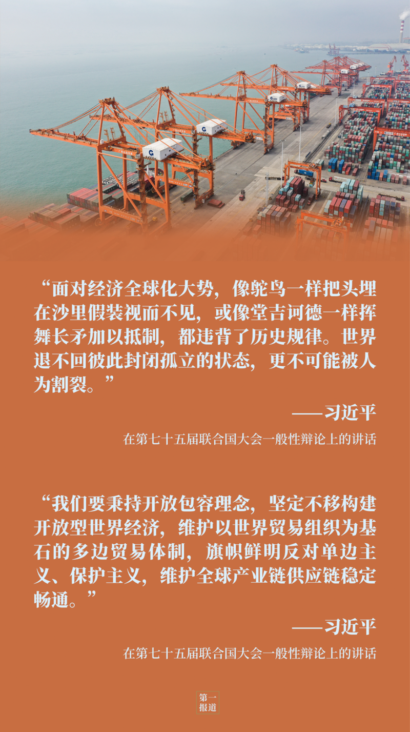 在聯合國“云講臺”,習主席還向國際社會生動闡釋了中國“新發展格局”與構建開放型世界經濟、推動全球經濟復蘇的關系:“我們不追求一枝獨秀,不搞你輸我贏,也不會關起門來封閉運行,將逐步形成以國內大循環為主體、國內國際雙循環相互促進的新發展格局,為中國經濟發展開辟空間,為世界經濟復蘇和增長增添動力?!?/p>