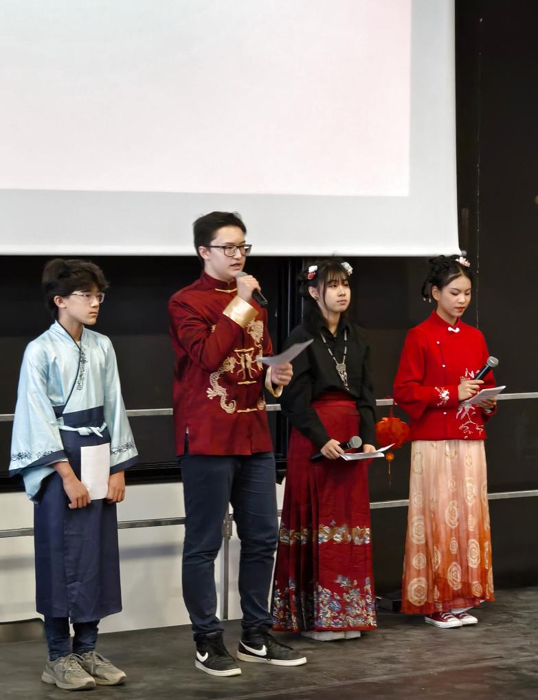 2月5日,在法国马诺斯克,普罗旺斯-阿尔卑斯-蓝色海岸大区国际学校学生在春节活动上表演。新华社发(普罗旺斯-阿尔卑斯-蓝色海岸大区国际学校供图)