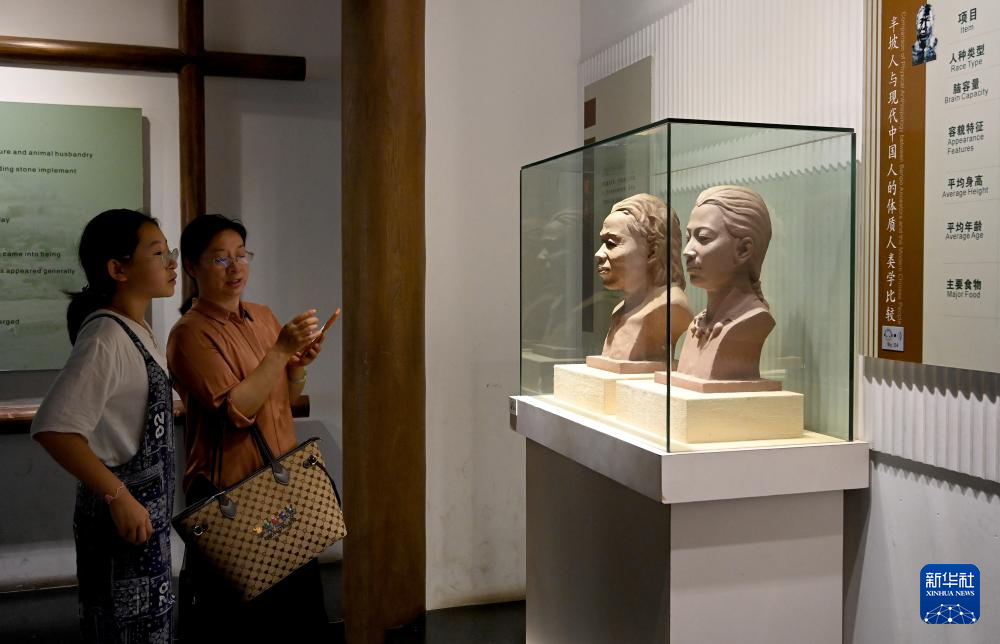 参观者在西安半坡博物馆里了解半坡人的特征(8月9日摄)。