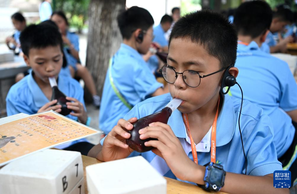 研学学生在西安半坡博物馆里体验陶埙吹奏(8月9日摄)。