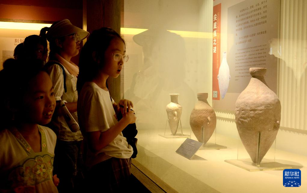 参观者在西安半坡博物馆里了解尖底瓶(8月9日摄)。