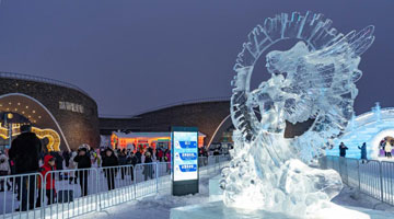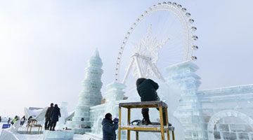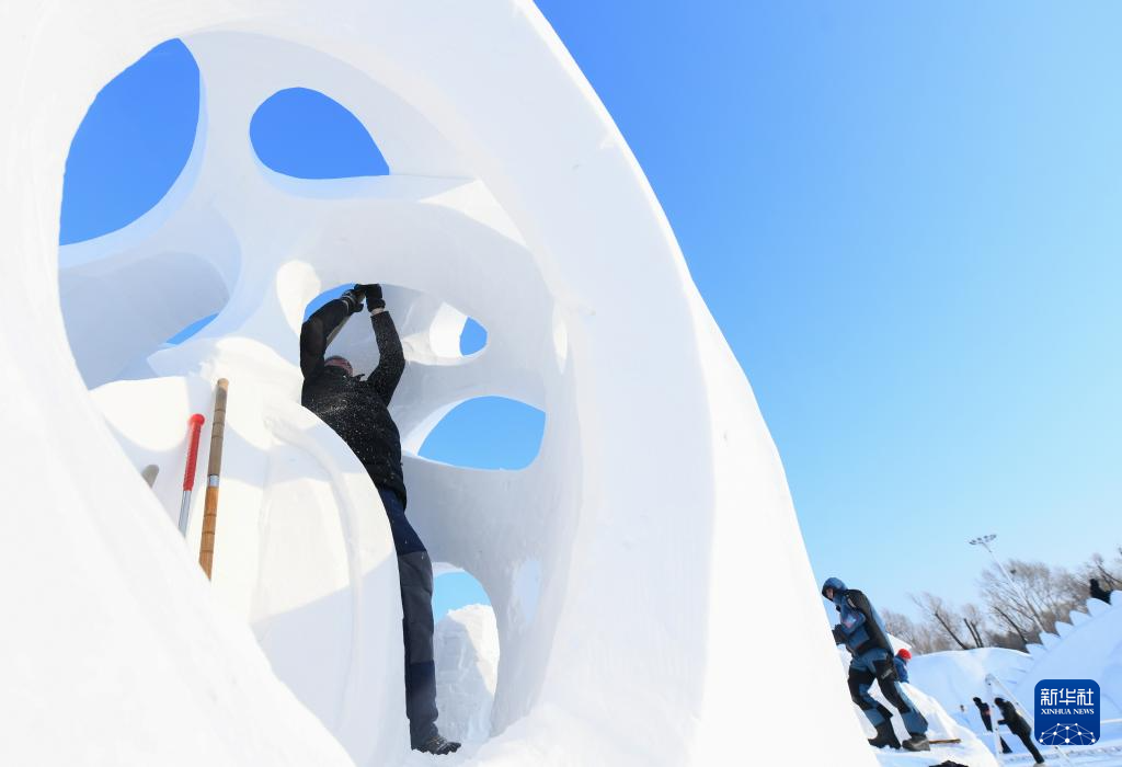 当日,在哈尔滨太阳岛雪博会园区内举行的第26届中国·哈尔滨国际雪雕比赛进入第三天的赛程。