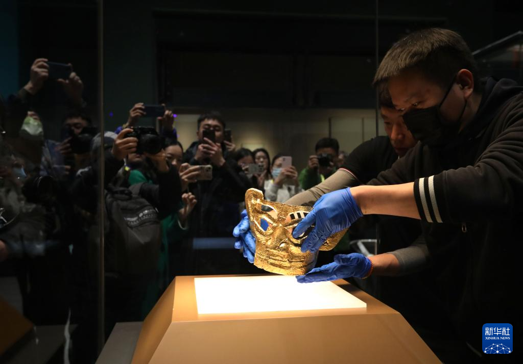 当日,四川广汉三星堆遗址出土的珍贵文物——金面具和竖披发青铜人像在上海博物馆东馆特展厅内开箱,移入展柜。坐落于黄浦江东岸的上海博物馆东馆将于2月2日启用,开幕展览“星耀中国:三星堆·金沙古蜀文明展”将对公众开放。
