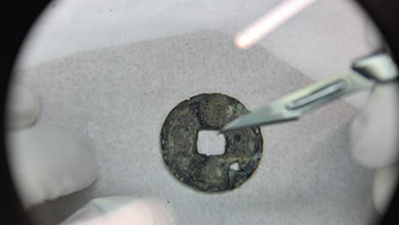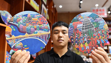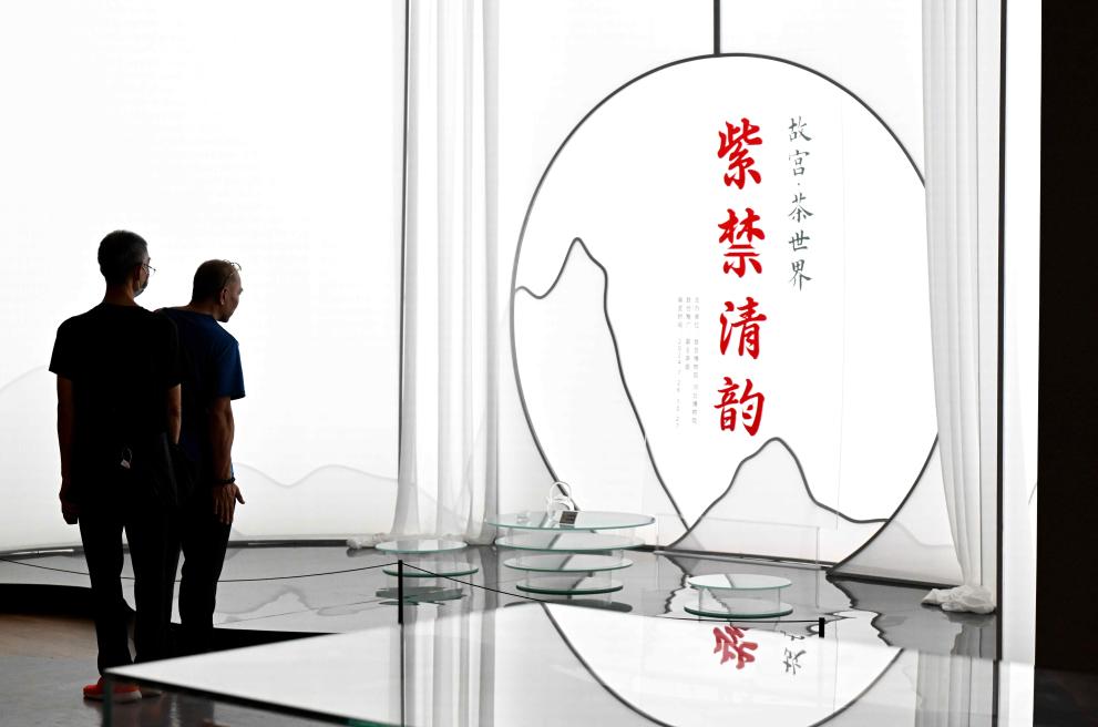 8月31日,海洋文化专家朱瑞良(左)在展览现场研究打捞出水的清代瓷器图案。