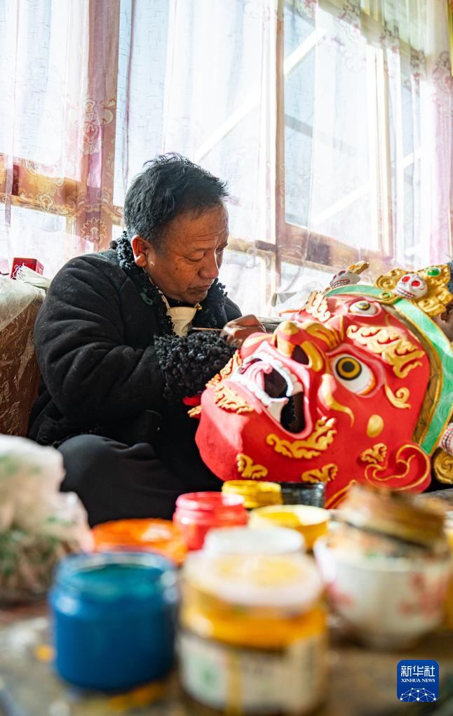 12月9日,西洛在合作社展览厅查看和同事们一起制作的西藏传统面具。