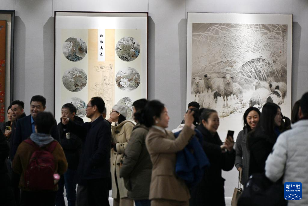 12月15日,观众从一幅动物题材的工笔画作品前经过。