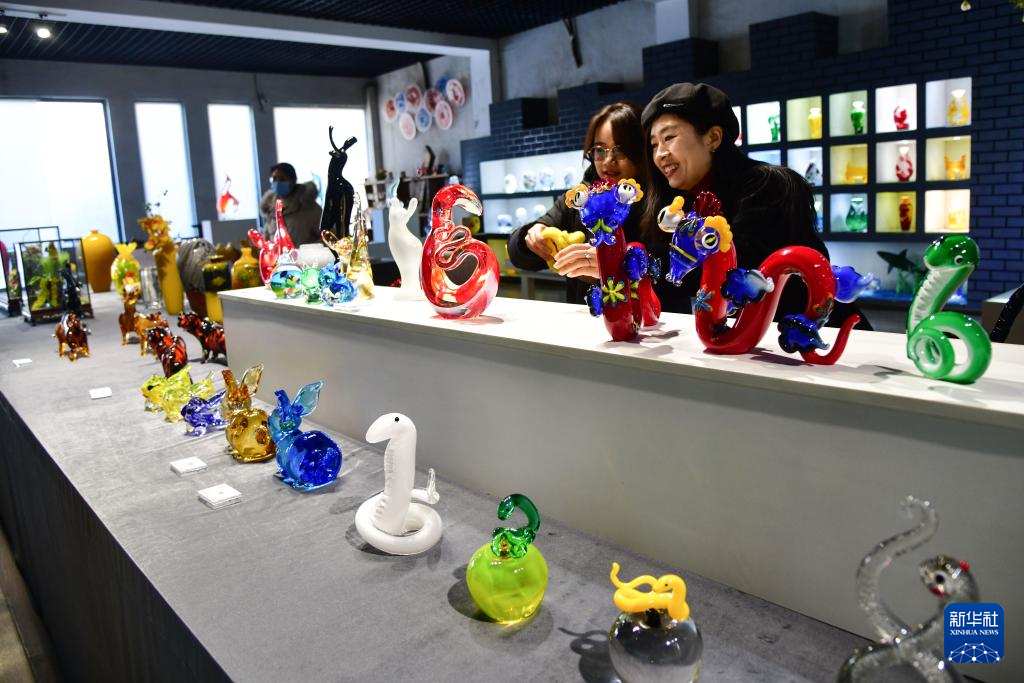 1月9日,消费者在淄博市博山区西冶工坊展销厅内挑选蛇年主题琉璃工艺品。