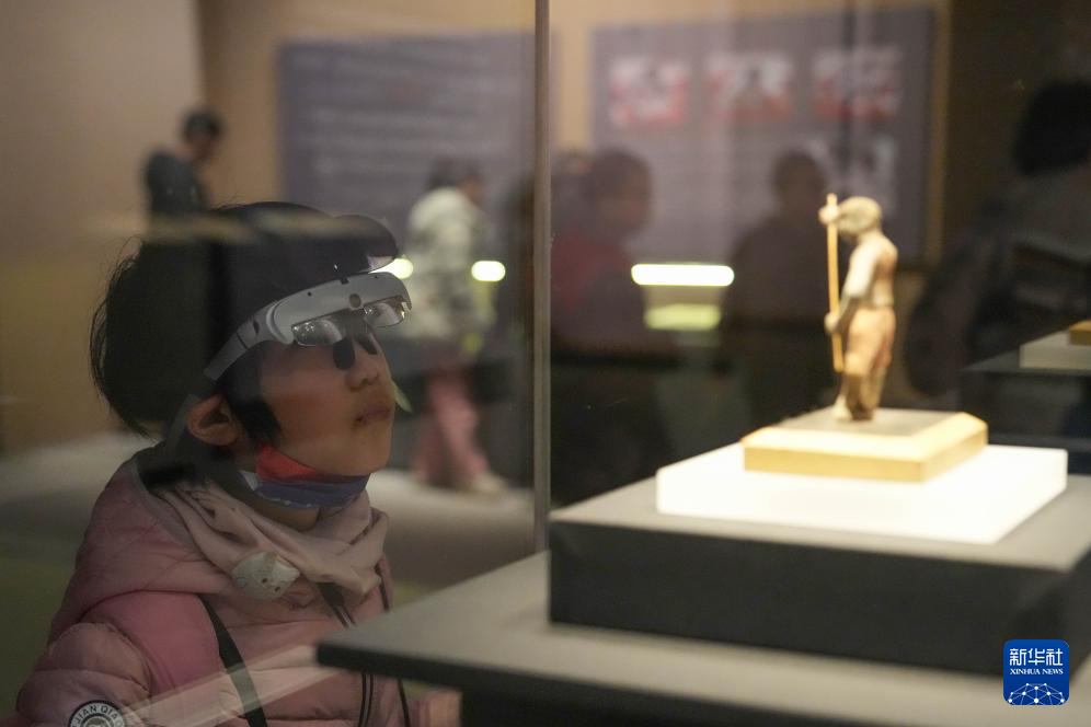 1月21日,观众在“聚宝之盆——新疆文物珍品展”观赏黑人百戏俑。