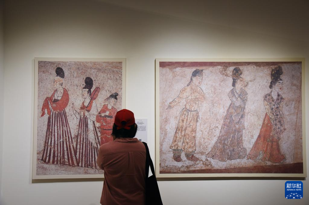 本场展览新增《出行仪仗图》《舞女图》等精彩壁画图像。其中,《出行仪仗图》展现了唐人华丽出行的场景,画中彩轿、骏马、人物皆巧扮盛装,盛世风貌令人赞叹;《舞女图》中,画家以流畅的线条、绚丽的色彩描绘一位舞者充满青春气息的曼妙舞姿,富有感染力与共鸣感。展场还特别设置汉服穿戴、壁画临摹、曲水流觞游戏等多项互动活动。