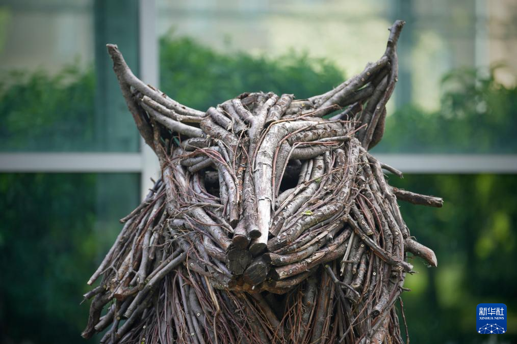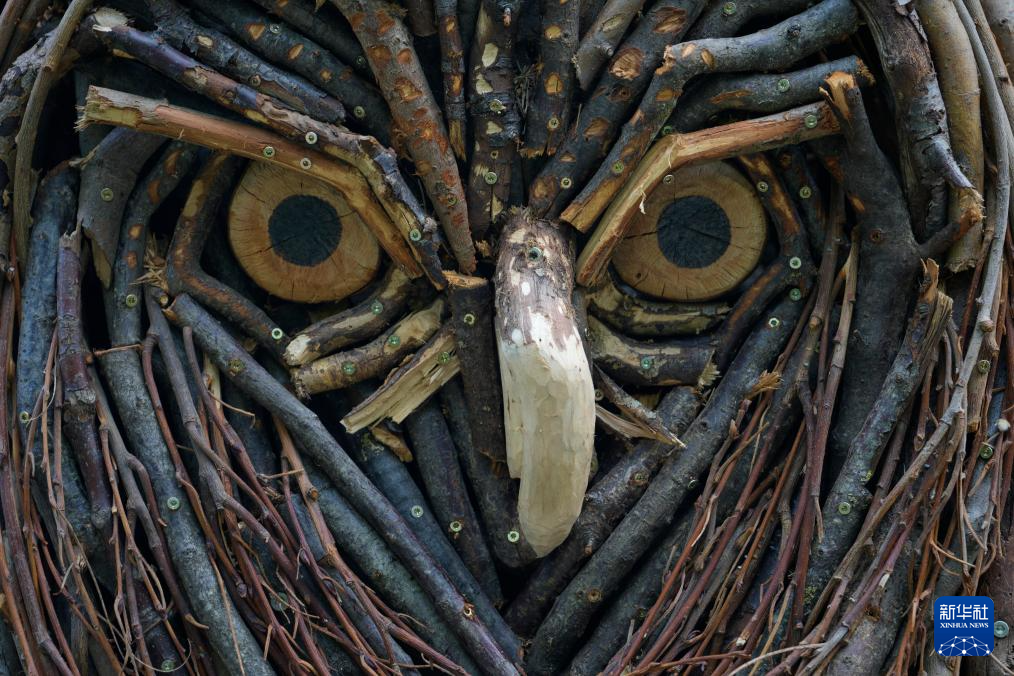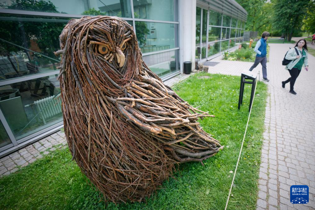 这是5月6日在波兰首都华沙拍摄的猫头鹰树枝雕塑。