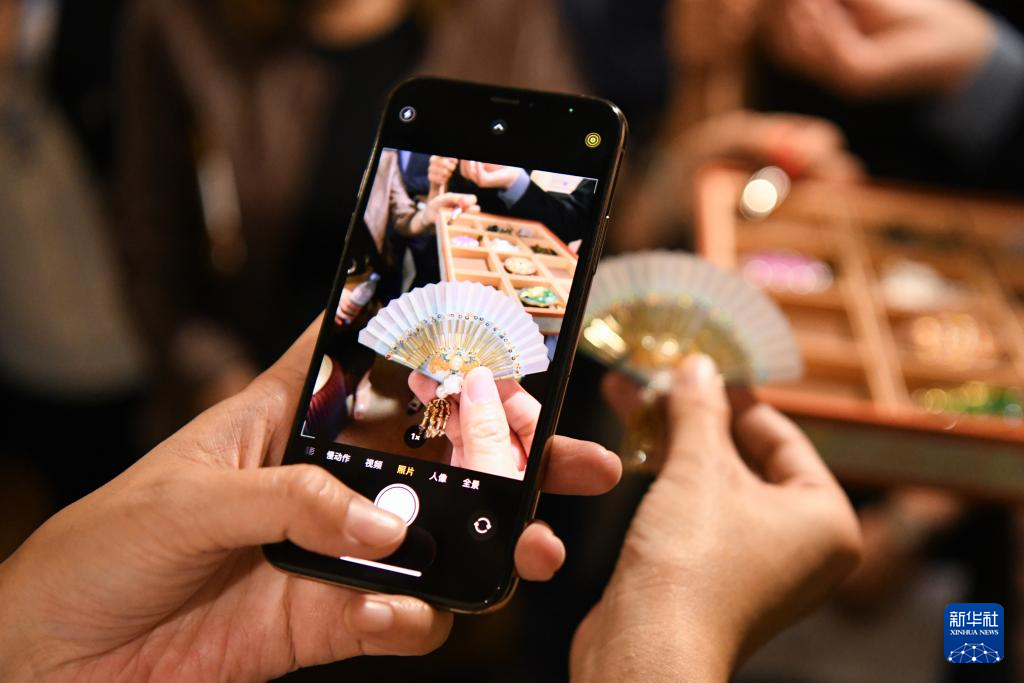 8月22日,在瑞士伯尔尼中国文化中心,嘉宾在 “安善萃锦——中式生活美学展”上拍摄精美饰品。