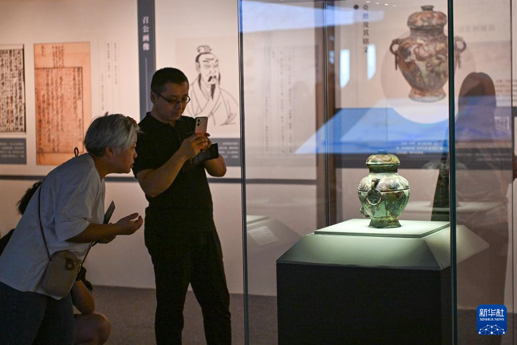 琉璃河遗址出土文物克盉(左)、克罍在展览中同时展出(8月28日摄)。