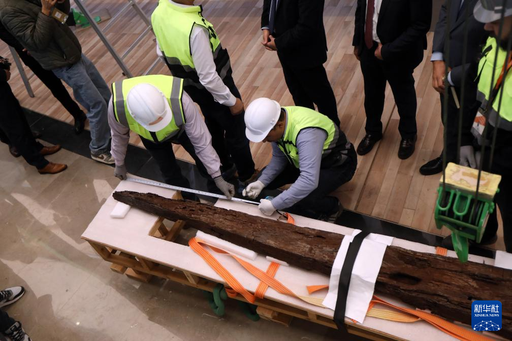 12月23日,在埃及吉萨的大埃及博物馆胡夫太阳船展厅内,埃及修复团队开展古埃及法老胡夫第二艘太阳船的组装工作。