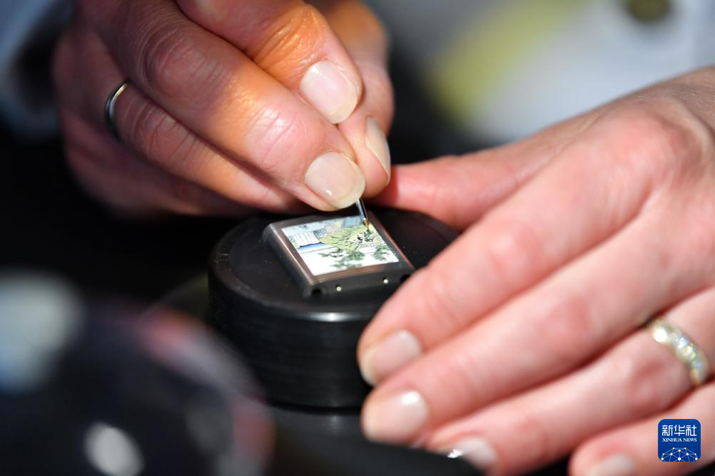 4月14日,在瑞士日内瓦举行的“钟表与奇迹”高级钟表展上,工匠展示表盘上的珐琅彩绘工艺。