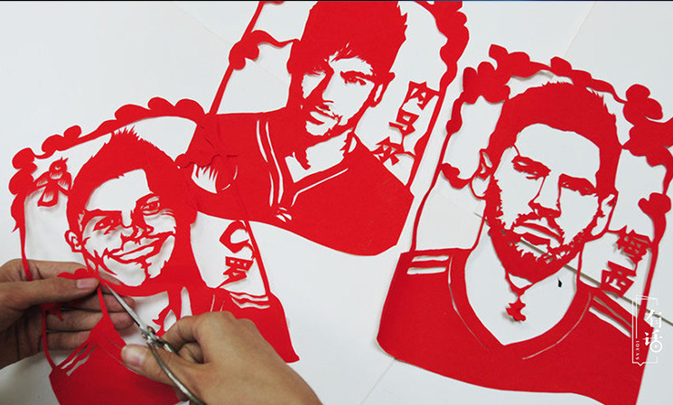 我之前剪過的民俗剪紙作品,像《白蛇傳》、《七月七鵲橋會》、《夜哭郎》等等,這些題材承載的是我們的傳統。但這些較為傳統的剪紙受眾并不多,所以我認為青年人要有新的創新,加入現代社會中許多時尚前衛的元素,這樣才能獲得更多人的喜愛。在2014年世界杯的時候,我就試著剪“世界杯剪紙”,梅西、C羅、內馬爾,讓一些球星躍然紙上,讓熱愛足球的年輕人去關注、了解到傳統的剪紙藝術。2015年是世界反法西斯戰爭勝利70周年,我看到關于戰爭的一些資料圖片后,就創作了一幅《南京大屠殺》剪紙。畫面中運用了黃色、紅色、黑色表現土地、火焰還有憤怒,這些都是用剪紙來表達我心中的感受。我的工作室現在也會做一些時尚的婚紗照剪紙,還有生日剪紙等,把這些傳統吉祥的寓意融入到現代人們的需求、裝飾和禮物中。