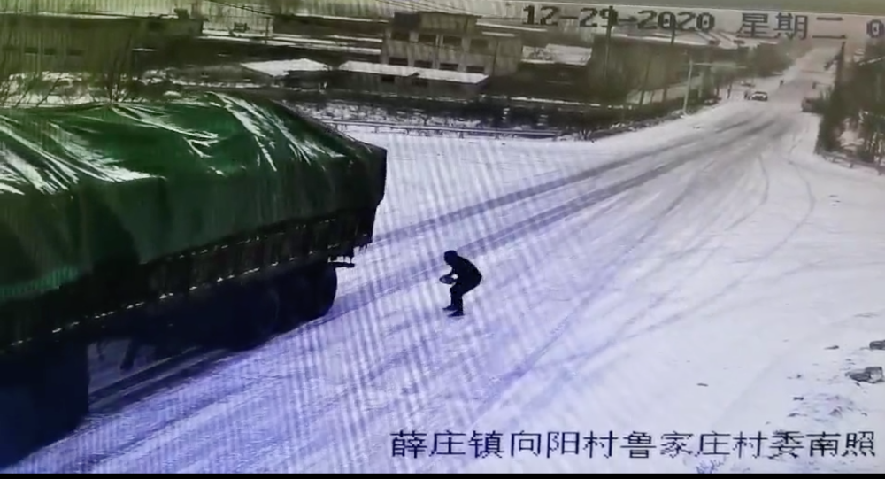 2020年12月29日,山東臨沂出現大雪降溫天氣,江蘇徐州一貨車在經過費縣時,因積雪上坡道路結冰,司機緊急制動于事無補,車輛不斷下溜。