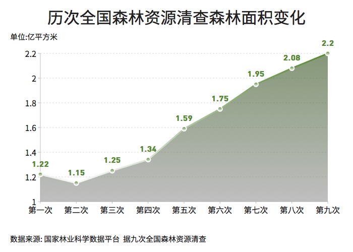 ??? 根據(jù)國家林業(yè)和草原局統(tǒng)計(jì),目前全國森林面積達(dá)到2.2億公頃,森林覆蓋率23.04%。回望九次全國森林資源清查結(jié)果可以看出,我國的森林覆蓋率逐年穩(wěn)步提高。還有一些監(jiān)測數(shù)據(jù)顯示,近20年來中國新增植被覆蓋面積約占全球新增總量的25%,居全球首位。