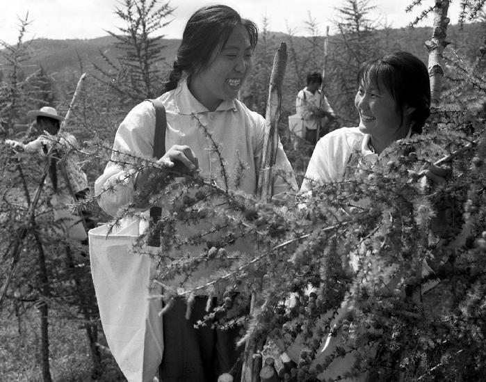 ??? 河北省圍場縣塞罕壩機(jī)械林場職工積極采摘松樹種,解決人工造林需要。新華社記者趙連升攝 1978年10月30日發(fā)