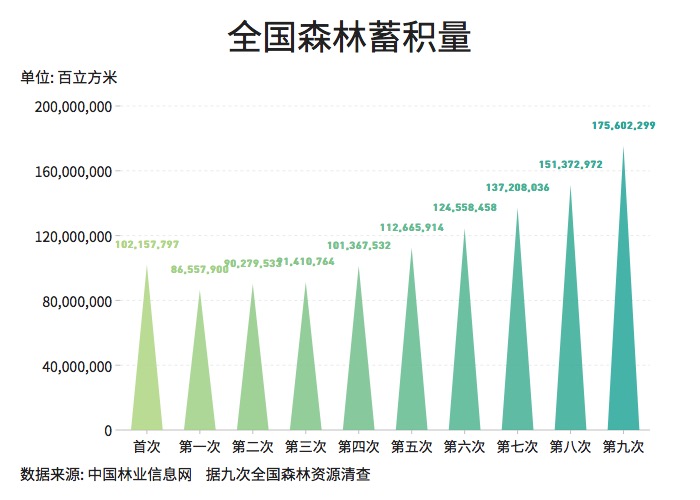 ??? 森林蓄積量是反映一個(gè)國家或地區(qū)森林資源總規(guī)模和水平的基本指標(biāo)之一,也是反映森林資源的豐富程度、衡量森林生態(tài)環(huán)境優(yōu)劣的重要依據(jù)。“十三五”期間,我國森林蓄積量超過175.6億立方米,森林植被碳儲(chǔ)量91.86億噸。