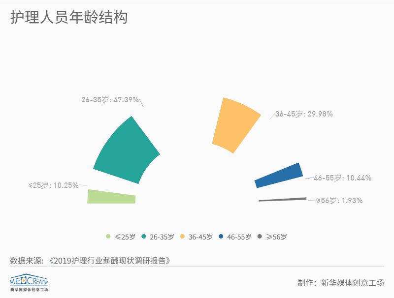 護士這一群體中,年輕力量居多。根據《護理管理雜志》統計數據顯示,26-35歲的護理人員占比幅度最大為47.39%,接近護理群體的近五成,36-45歲年齡段的護理人員次之,26-45歲年齡段的護理群體是整個護理行業的中流砥柱。