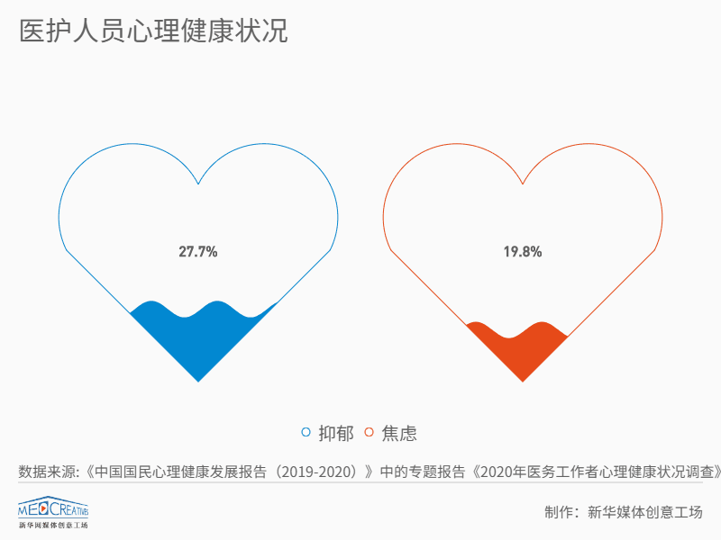 根據最新出版的心理健康藍皮書《中國國民心理健康發展報告(2019~2020)》中,對醫務人員進行了一期專題報告《2020年醫務工作者心理健康狀況調查》的數據顯示,27.7%的醫護工作者可能存在抑郁傾向,19.8%的醫護工作者有焦慮傾向。護士群體的焦慮水平僅次之醫生,護士抑郁高風險比例為9%,30—45歲醫務工作者抑郁水平最高。